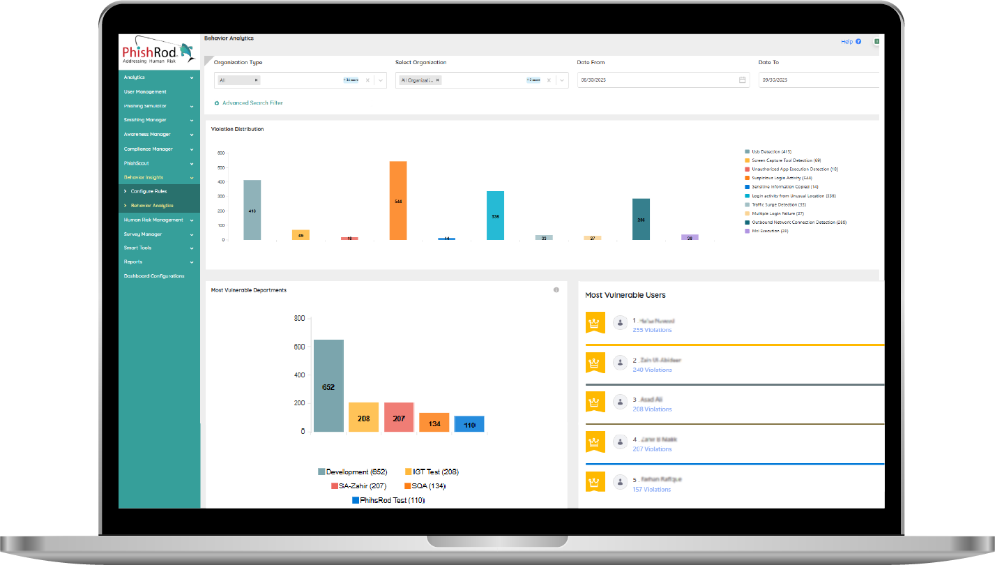 It is an integral component of the PhishRod suite which complements our methodology to address human risk. While security awareness automation, phishing readiness, policy compliance & phishing incident response form the basis for a cyber secure culture in an organisation, BehaviorInsights monitors end user behavior in real-time and proactively manages human risk.